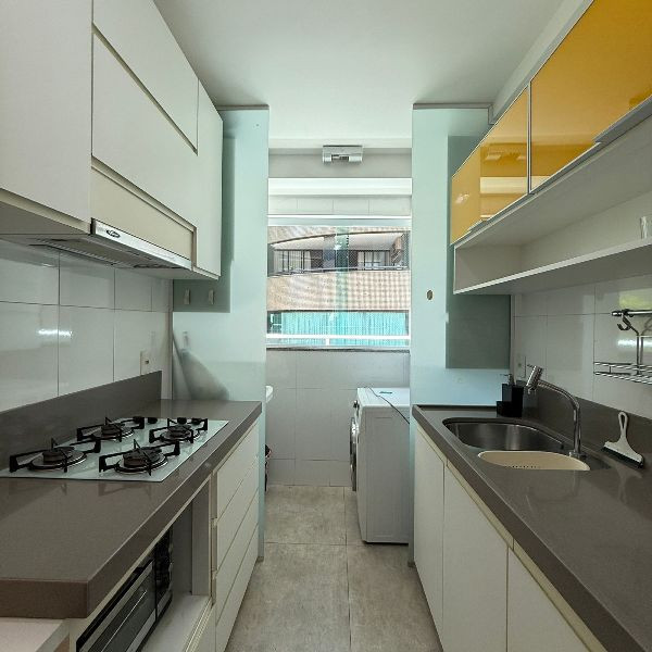 - Cozinha com armários planejados, fogão, coifa e geladeira;